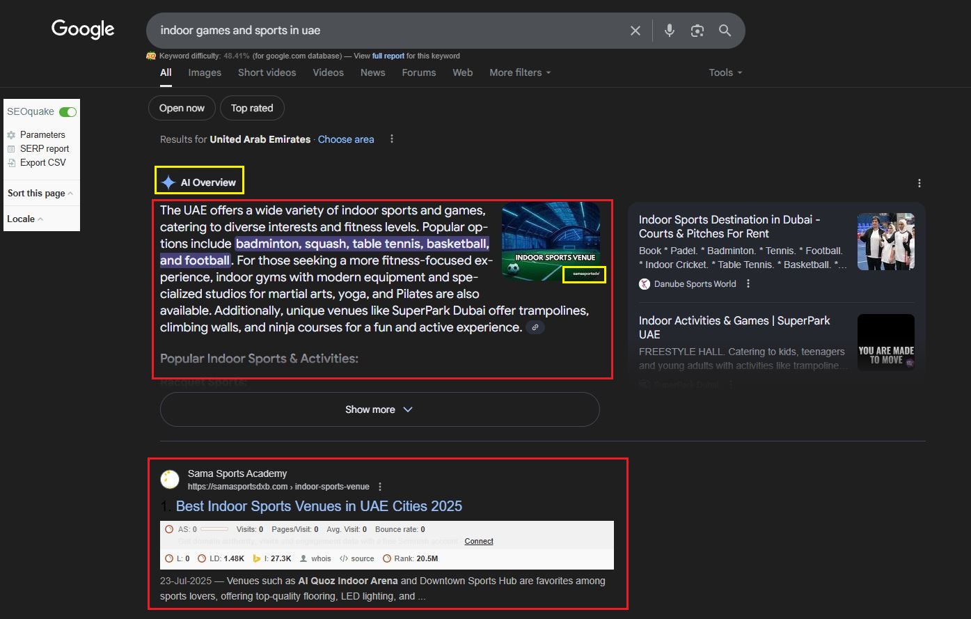 Proven SEO strategies helped this content rank for [indoor sports and outdoor sports in uae] and be featured in Google AI Overview snippets.